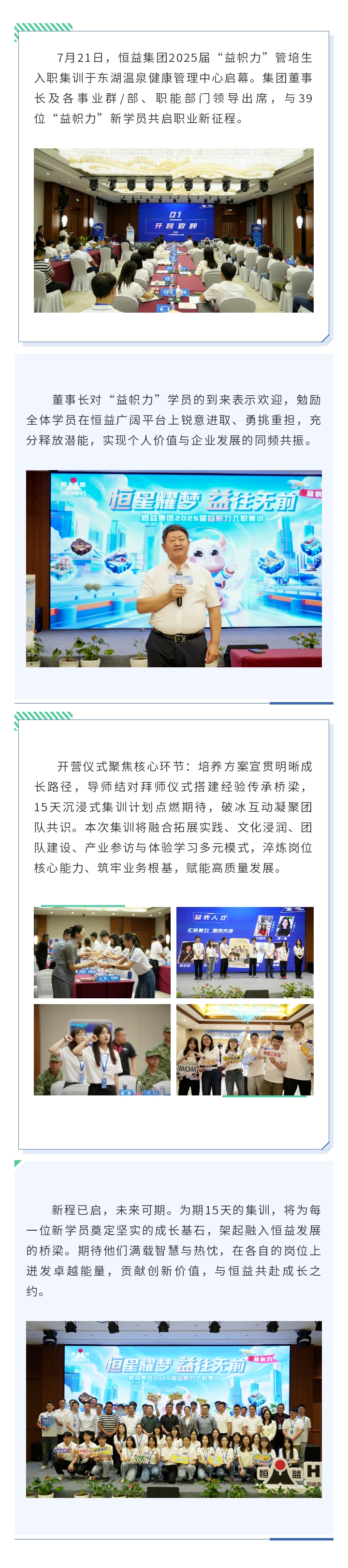 恒益集團2025屆“益幟力”管培生集訓開營啦! 來源: 瀏覽量:1196 日期:2025-07-22 分享到: 上一篇:恒益集團與萬博集團攜手共建揚州溫泉醫(yī)康養(yǎng)項目 下一篇:恒益集團召開第三屆董事會第三次會議暨2025年半年度經(jīng)濟運行分析會議