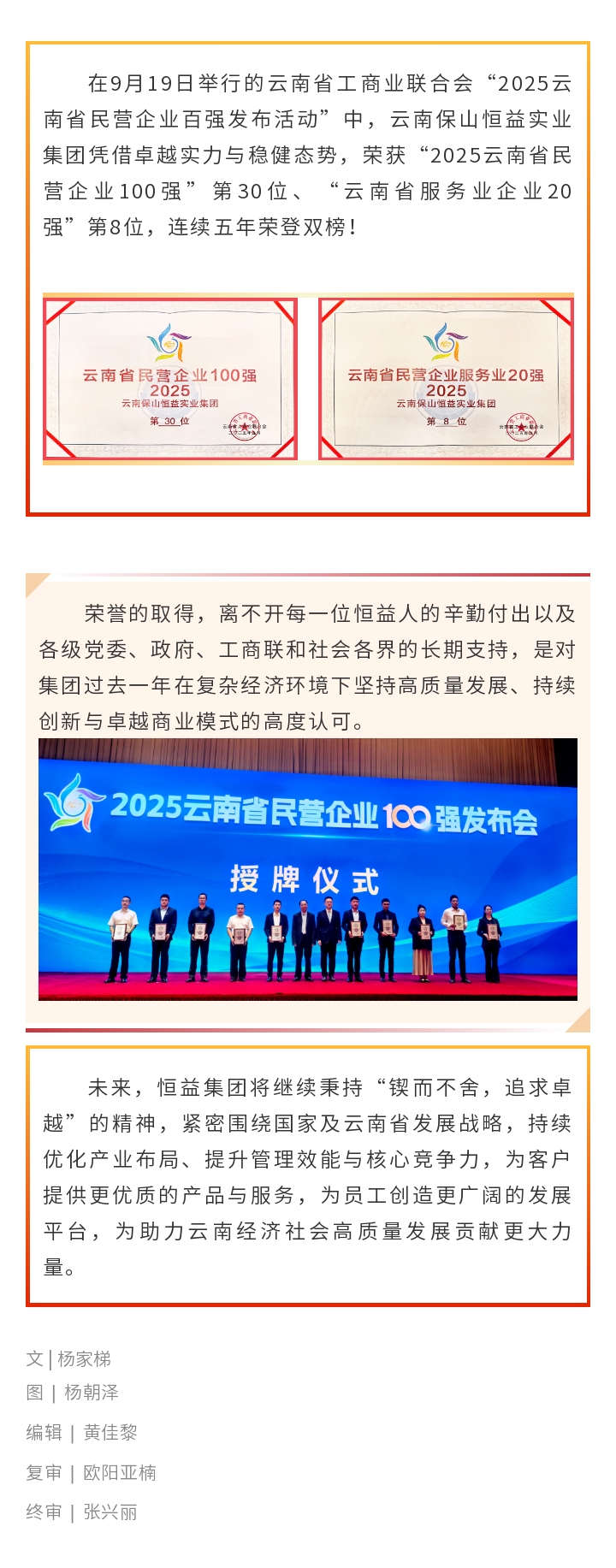 榮登雙榜!恒益集團(tuán)榮獲2025云南民企百強(qiáng)第30位、服務(wù)業(yè)20強(qiáng)第8位 來源: 瀏覽量:917 日期:2025-09-19 分享到: 上一篇:恒益集團(tuán)開展高管刑事法律風(fēng)險(xiǎn)防范與合規(guī)體系建設(shè)專項(xiàng)培訓(xùn) 下一篇:恒益集團(tuán)與省心說科技達(dá)成合作 共筑微信電商新生態(tài)
