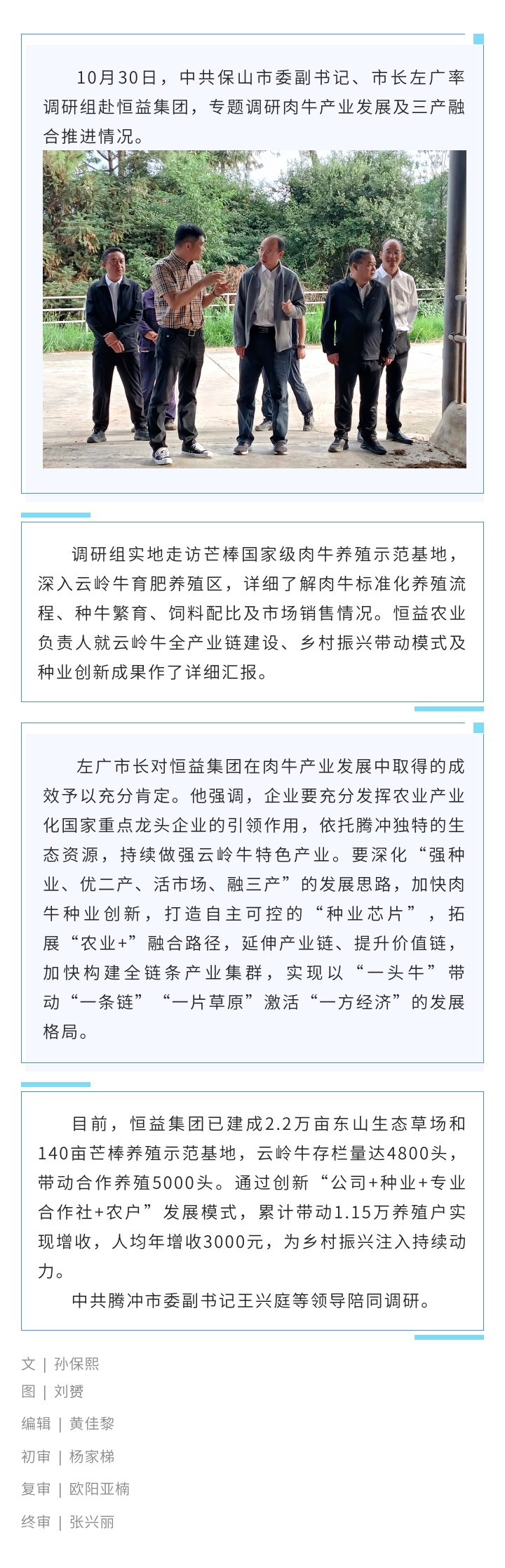 保山市市長(zhǎng)率隊(duì)調(diào)研恒益集團(tuán)云嶺牛產(chǎn)業(yè)發(fā)展情況 來(lái)源: 瀏覽量:112 日期:2025-10-31 分享到: 上一篇:恒益溫泉醫(yī)康養(yǎng)(儀征)項(xiàng)目正式啟動(dòng) 致力打造長(zhǎng)三角溫泉醫(yī)康養(yǎng)產(chǎn)業(yè)新標(biāo)桿 下一篇:共筑康養(yǎng)新未來(lái) | 恒益集團(tuán)與古兜控股強(qiáng)強(qiáng)聯(lián)手,簽署戰(zhàn)略合作協(xié)議